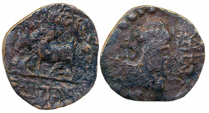 Eastern Chalukyas of Vengi, Vishnuvardhan VI or later, Uninscribed Alloyed Copper, 1.56g, Obv: Stylized lion standing with gaping mouth, small dagger above, Rev: Goddess seated cross-legged, flanked by two standing human figures, which appear to be bathing her (Unpublished in major publications). Extremely fine, extremely rare.