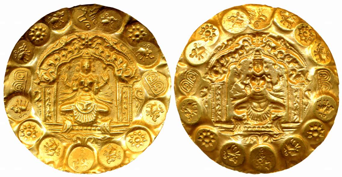 Rashtrakutas, North / Central Karnataka region, Govinda III alias “Prabhutavarsha Pratapavaloka Jagattunga”, Gold Gadyana, 4.20g, Obv: King mounted on a Horse, riding to left, with a curved object held in raised hand, pseudo- Arabic legend around, Rev: Pseudo- Arabic legend along the margins, in centre, two line inscription in proto Devnagari/ Siddha legend – “Shri Jagatunga Aprati / hata gata Garudadhwaja” Above the legend, a row of Vaishnavite and auspicious symbols - Lotus, Kalasha and Sankha and below the legend, a half Lotus pedestal supporting the legend. Extremely fine for type, extremely rare.