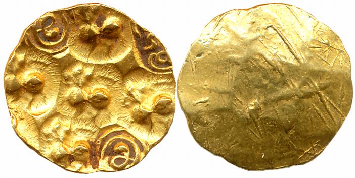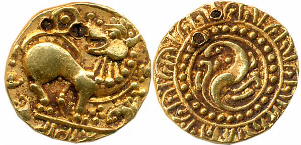 Nolambas of Nolambavadi, Jagadekamalla Immadi Nolamba Pallava Permanadi, Punch Marked, Uniface, Gold Two-Gadyana, 7.42g, 58 mm, with 13 repousse punches, the coin is as broad as an adult’s palm, 1x central punch of recumbent Nandi facing right seated on a decorated pedestal, within a floral circular border, with 1x small Sun & Moon symbol punch. 12x circumfluent punches bearing Kannada letters “Sri I mma di (ra) No La mba Naa raa ya Na” starting from 10 O’clock position on the outer periphery on obverse. Pleasing specimen with clearly formed punches. Extremely fine, exceedingly rare. The Nolambas were one of the significant political powers of South India with their initial capital at Chitradurga. They shifted their capital to Hemavathi subsequently and ruled for nearly 300 years. They remained mostly a significant feudatory dynasty and with a turbulent ruling. They constantly suffered war with the Gangas and hence their coins are extremely rare. This is a golden opportunity to own a unique double-Gadyana.