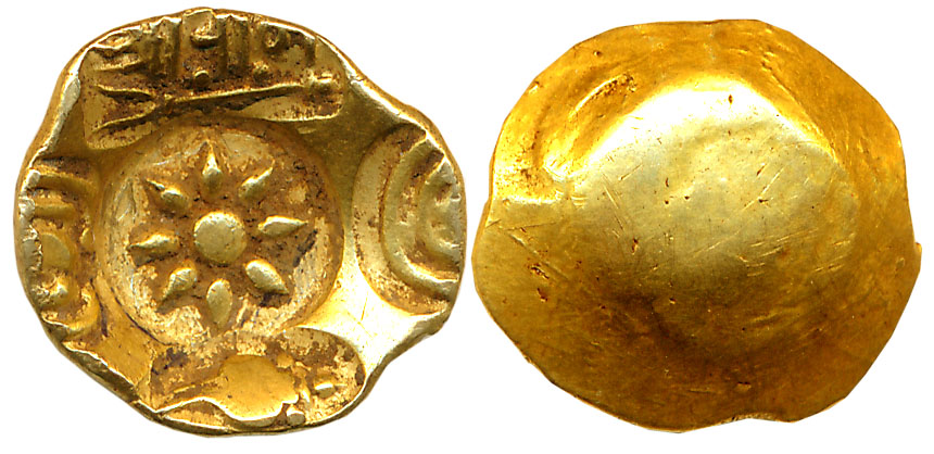 Imperial Cholas, Rajaraja I, Gold Fanam, 0.46g, Obv: Tiger, Parasol above 2 Fishes, a strung bow to left, Rev: Two Line Devnagari legend “Yuddha Malla” (K Ganesh# 1.7). Very fine.
