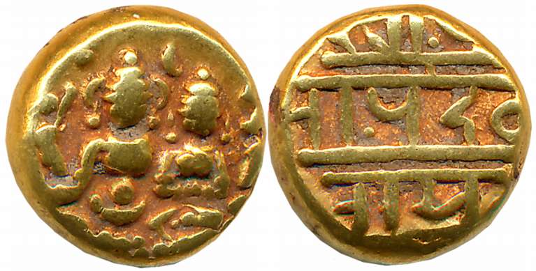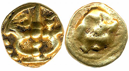 Yadavas of Devagiri, Ramchandra Deva, Gold Gadyana- Padma Tanka, 3.78g, Uniface, Punch Marked, Lotus in centre, 2 punches of Kannada letter “Shri”, 1 punch of Shankha, and 1 punch of Devnagari legend “Sri Ram” (Mitch K&A #289). Extremely fine.