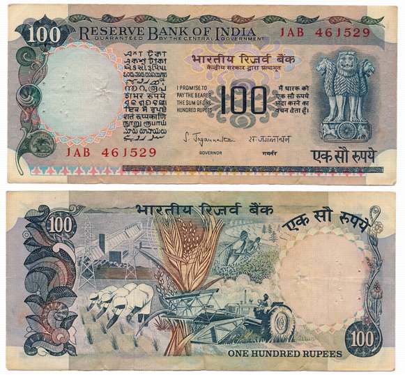 Rupee 100 (7), “G-8”, Type 6.7.5, Signed by P. C. Bhattacharya, Prefix AA/55 (R IPM # 6.7.5.1), “G-9”, Signed by L. K. Jha, Prefix AB/54 (R IPM # 6.7.5.2), “G-12,13”, Type 6.7.7, Signed by S. Jagannathan, Prefix AE/0, AF/0 (R IPM # 6.7.7.1A, 6.7.7.1B), “G-14”, Signed by K. R. Puri, Prefix AJ/3 (R IPM # 6.7.7.2), “G-15”, Signed by M. Narasimham, Prefix AK/61 (R IPM # 6.7.7.3), “G-16”, Signed by I. G. Patel, Prefix AA/30 (R IPM # 6.7.7.4). 7 Notes.