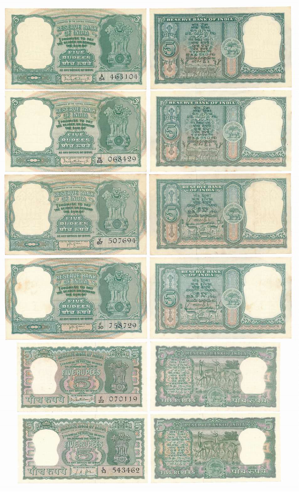 Rupee 2 (5), “B-4”, Type 6.2.3, Signed by H. V. R. Iengar, Prefix S/56 (R IPM # 6.2.3.2), “B-5”, Type 6.2.4, Signed by P. C. Bhattacharya, Prefix C/21 (R IPM # 6.2.4.1), “B-6”, Type 6.2.5, Signed by P. C. Bhattacharya, Prefix E/85 (R IPM # 6.2.5.1), “B-7”, Type 6.2.6, Signed by P. C. Bhattacharya, Prefix D/90 (R IPM # 6.2.6.1), “B-8”, Type 6.2.6, Signed by L. K. Jha, Prefix G/57 (R IPM # 6.2.6.2). 5 Notes.
