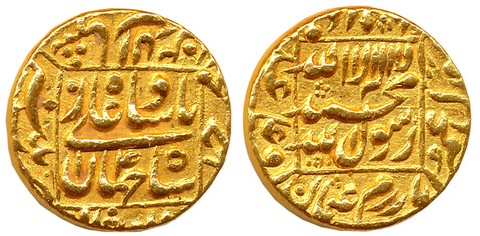 Jahangir, Gold Mohur, 10.90g, Agra Mint, AH 1022/ RY 8, Ilahi Month Farwardin, Obv: Emperor full name “Nur ud din Jahangir Shah (bin) Akbar Shah”, Rev: Sanah 1022/ 8 “Mah Farwardin Ilahi Zarb Agra” (KM# 176.1 type). Complete dotted border on both sides. Slab & Graded by NGC as MS 61. Emperor Jahangir’s coins are known for various Poetic couplets designs & for superb calligraphy. Mughal art at its zenith during Emperor Jahangir period. Emperor Jahangir was taking keen interest in his coins (Jahangirnama). His Portrait, Zodiac & beautiful poetic couplet coins are master pieces of Mughal Numismatic.