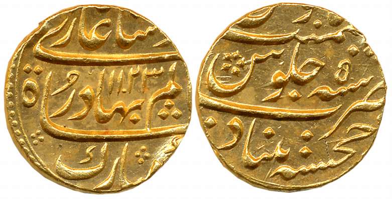 Shah Jahan, Gold Mohur, 10.89g, Patna Mint, RY 14, central inscription within square, knots at corners on both sides (KM# 260.14). Very fine+, very rare.