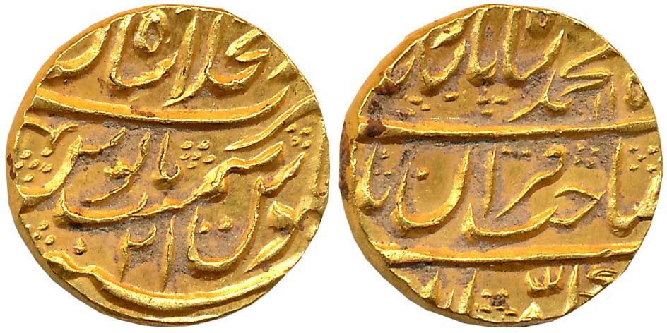 Muhammad Shah, Gold Mohur, 10.87g, Farkhanda Bunyad (Hyderabad) Mint, Numeral 22 on obverse (KM# 438.8). Extremely fine.