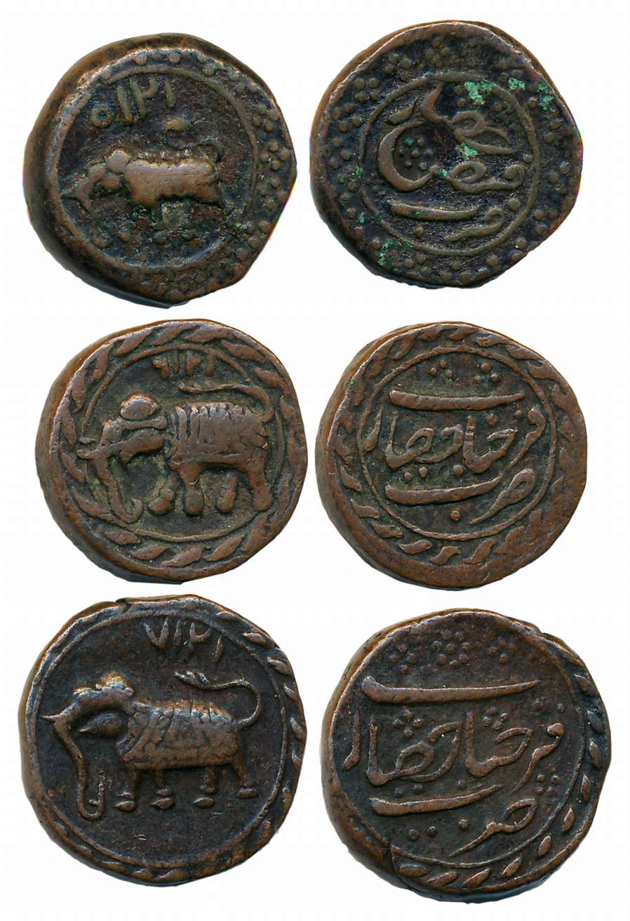 Haidar Ali, Gold Mohur, 10.88g, Bahadurpattan Mint, in the name of the Shah Alam II, RY 14, Obv: Persian legend “Sikka zad bar haft kishwar saya e fazle elah, hame e din Muhammad shah alam bahadur”, Rev: Persian legend “zarb Bahadurpattan sanat 14 “he” (for Haider Ali) jalus Maimant manus” (KM# 6). About extremely fine, exceedingly rare.
