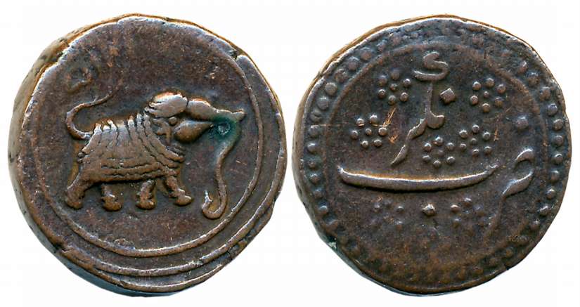 Tipu Sultan, Copper 2 Paisa- Mustari, 22.38g, Dar ul Sultanate Nagar Mint, AM 1224 (retro), Elephant facing left, flag above, Rev: Mint name and Date (KM# 104.5). Extremely fine, very rare.