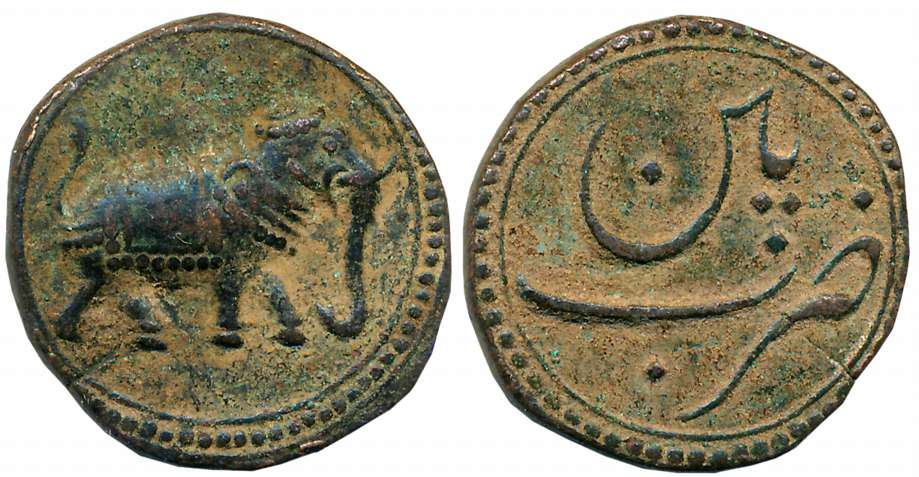 Tipu Sultan, Copper Paisa- Zohara, 10.89g, Patan Mint, AM 1217, Elephant to left (KM# 123.1). About extremely fine.