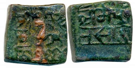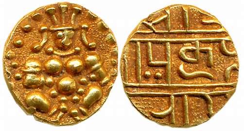 Shilaharas of Karad, Gold Double Fanam, 0.78g, Obv: Trisul, Rev: Globule (Mitch# K & A 246).