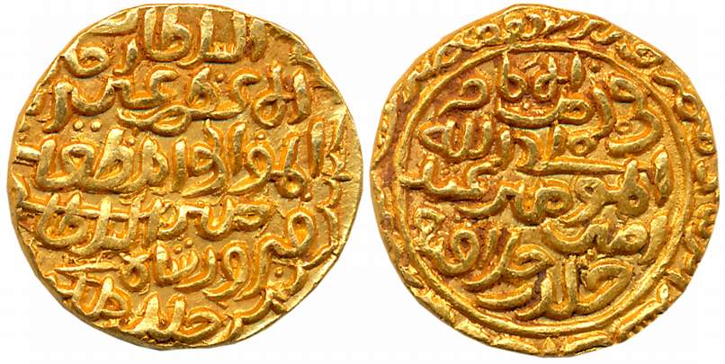 Muhammad bin Tughluq, Gold Dinar, 12.84g, “fi zaman/ Shahda” type, Hadrat Deogir Mint, AH 727 (Date in Numeral), Obv: Arabic legend “duriba fi zaman al abd al raji rahmat allah muhammad bin tughluq” Rev: Shahada (G&G# D335). Very fine, very rare.