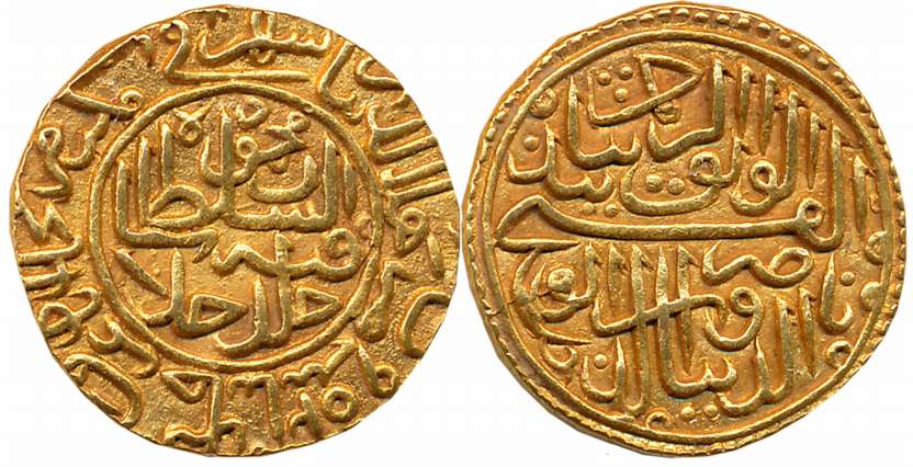 Ala al-Din Humayun Shah, Gold Tanka, 11.09g, AH 865, Arabic legend on both sides, Obv: “al mutawakkil ala llah al qawl al ghant abu’l mughazi”, Rev: “ala’ al-dunyawa’l din Humayun Shah bin Ahmad Shah bin Ahmad Shah al-wali al- bahamani” (G&G# BH 95). Extremely fine, very rare.