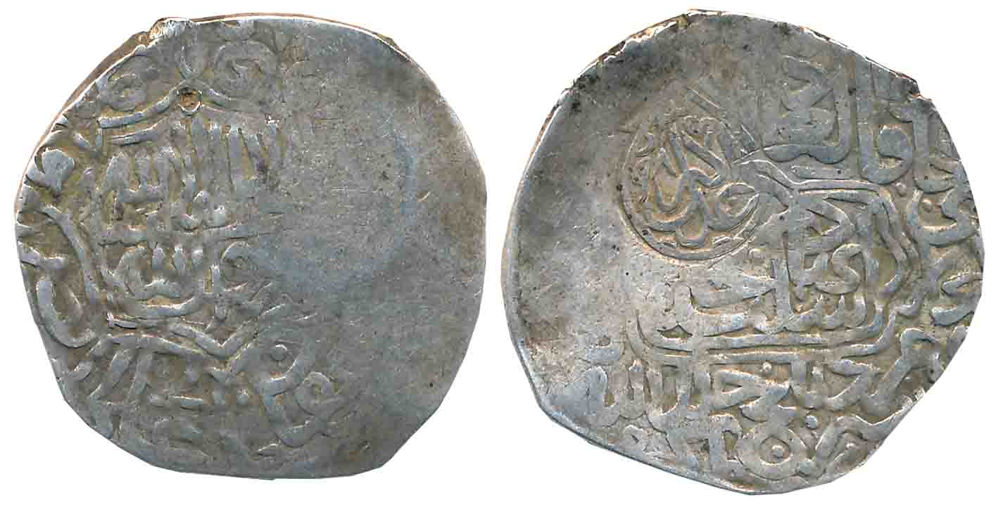 Akbar, Silver Shahrukhi, 4.57g, Kabul Mint, AH 983, countermarked on a tanka of Shaybanid ruler Iskandar Bahadur Khan, uncertain mint, Obv: Kalima in circular dotted cartouche, Rev: In a diamond-shaped dotted cartouche the name of Iskandar Bahadur Khan, other titles around, countermarked Adl Kabul 983 in a rectangular box. Very fine+ extremely rare.