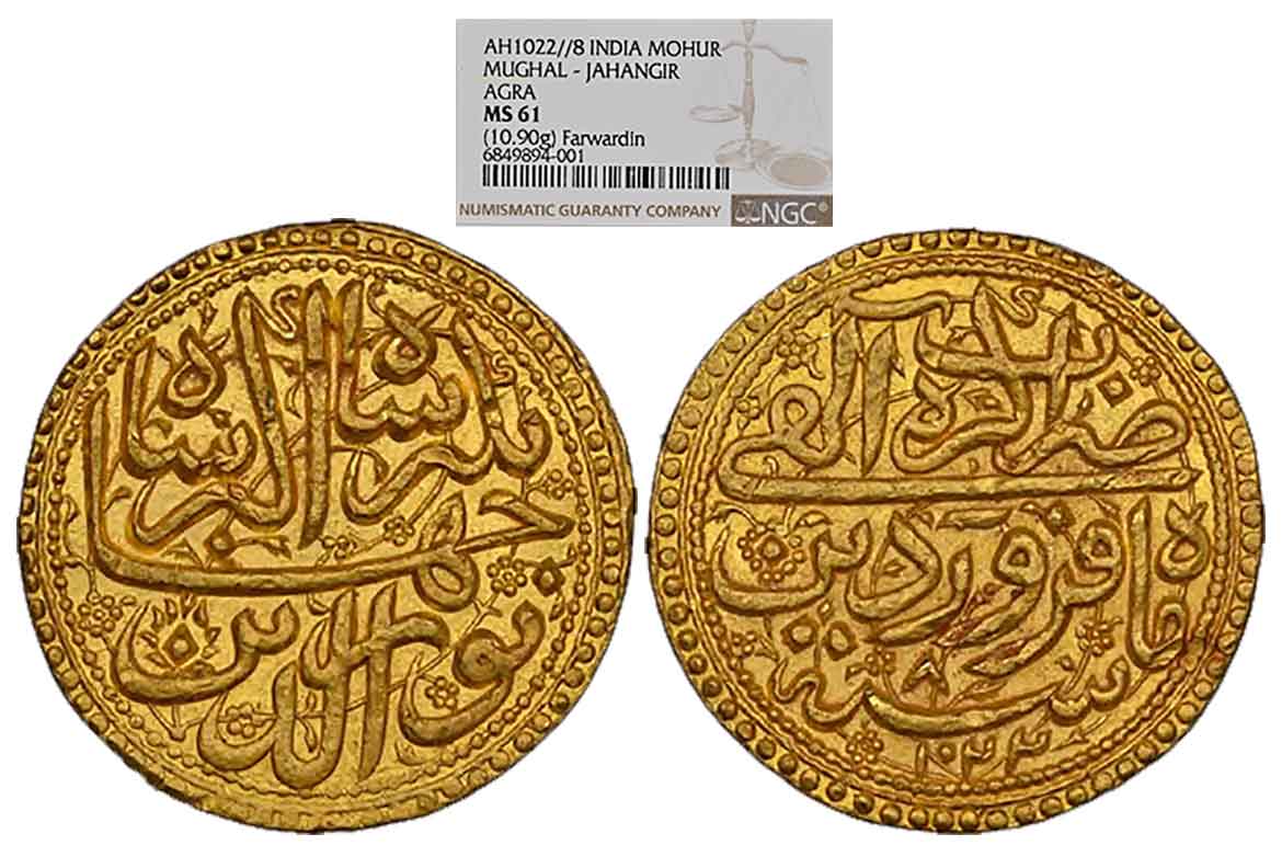 A very rare specimen struck at Lahore immediately after Akbar’s accession.