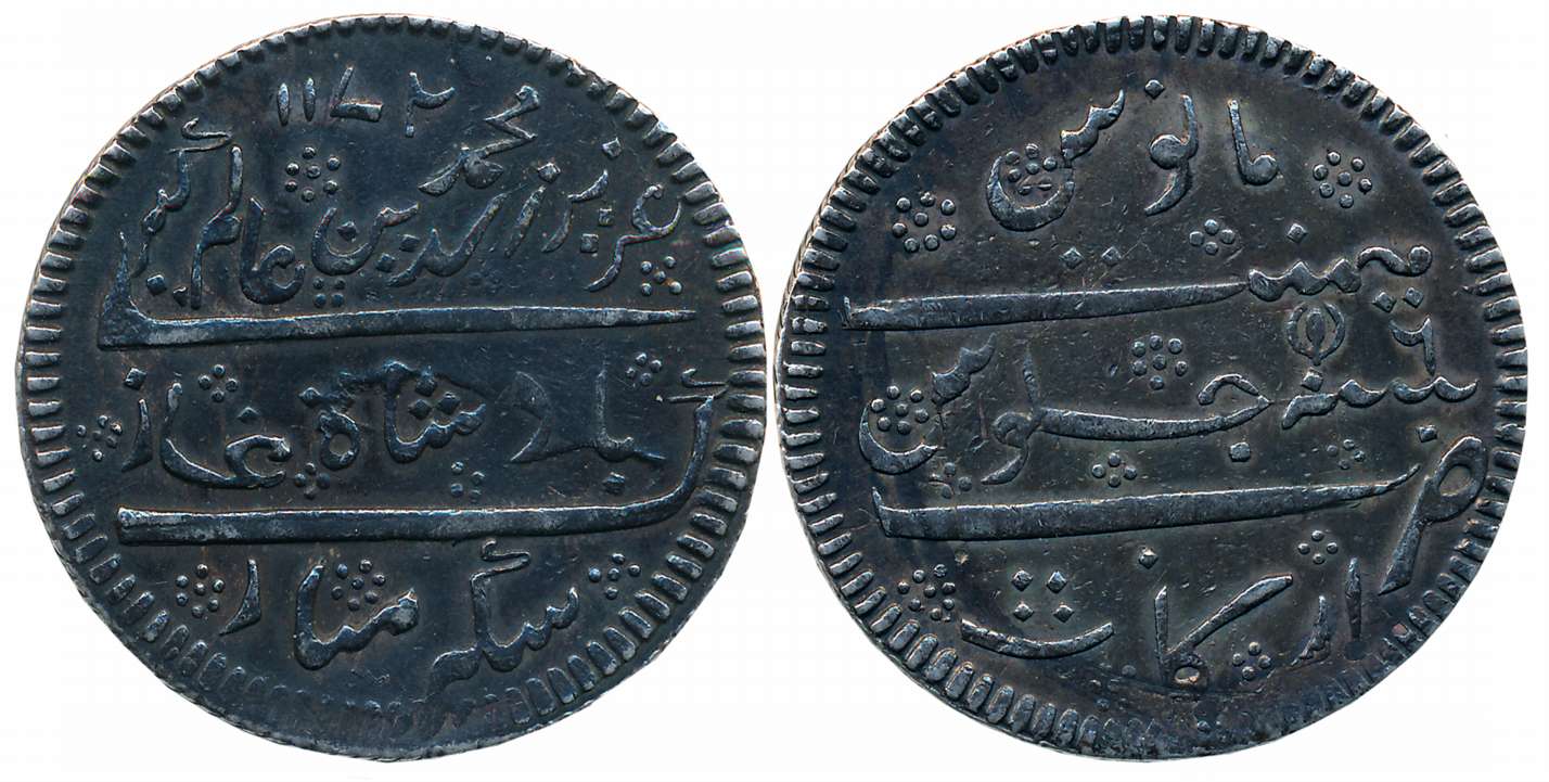 Mumbai, Gold Mohur, 11.48g, in the name of Alamgir II, RY 9, Persian legend on both sides, Obv: “Sikka Mubarak, Badshah ghazi Alamgir”, Rev: “Zarb Munbai sanah 9, julus maimanat manus” (Prid# 8, P Steven# 2.76). Extremely fine for type, extremely rare. The Bombay council succeeded in 1717 to strike Mughal style coinage with the Mint name Munbai. Gold coins struck in the style of Silver Rupee but they were struck in very small numbers & are extremely rare.