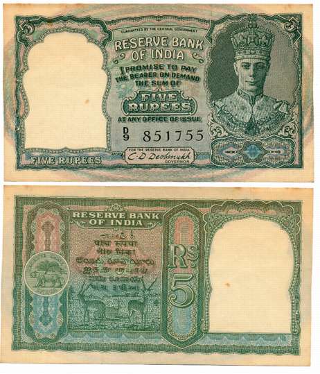 George VI, Water Mark Proof, Rupees 5, In bold letter RESERVE BANK OF INDIA. About extremely fine.