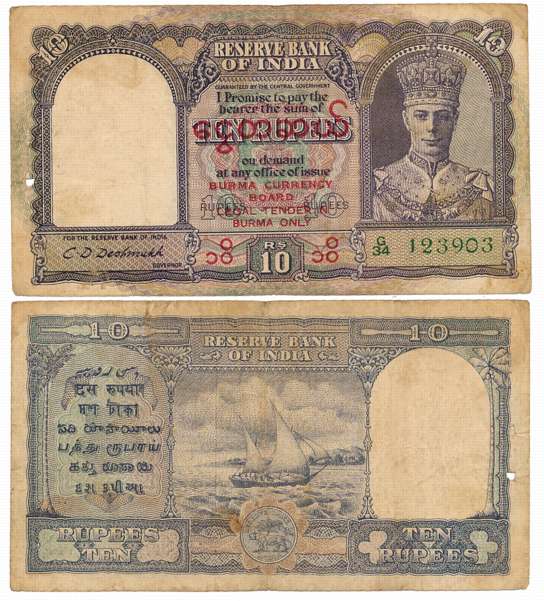 Burma Reserve Bank of India, George VI, Rupee 5, Type 5.4, Signed J. B. Taylor, Prefix A/28, Burmese legend on reverse (R IPM# 5.4.1). Extremely fine+.