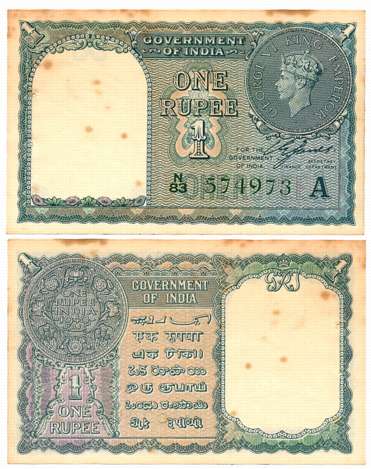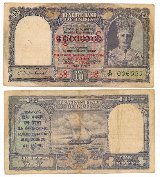 Military Administration of Burma, George VI, Rupee 1, 1940, Type 5.9, Signed C.E. Jones, Inset A, Prefix E/88, Serial number in Green (R IPM# 5.9.1B). Very fine.