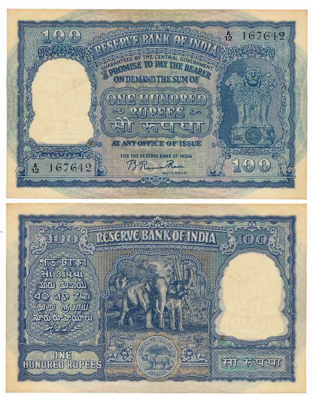 Rupees 100, 4th issue, Type 6.7.3, Madras Circle, Signed by B Rama Rau, Prefix Q/13, Serial number in Red (R IPM# 6.7.3.1). About extremely fine.