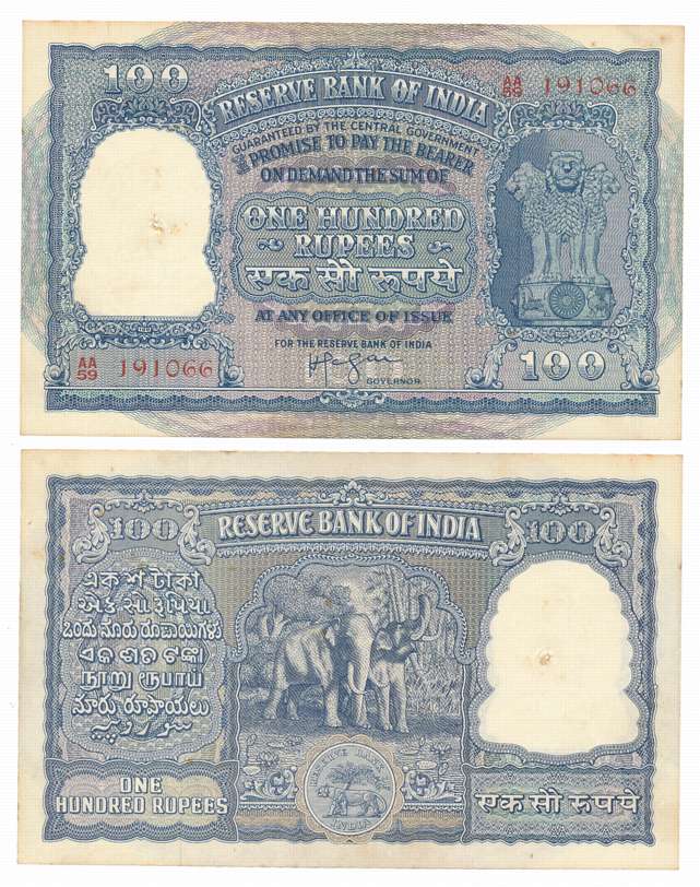 Rupees 100, Type 6.7.4, Signed P C Bhattacharya, Prefix AC/38, Serial Number in Red (R IPM# 6.7.4.2). Minor stain, about uncirculated.