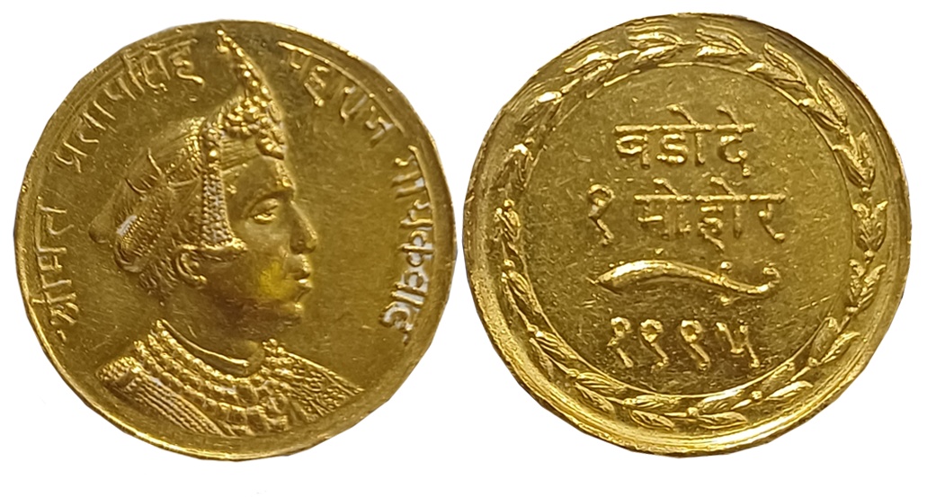 Randhir Singh, Gold Mohur, 10.81g, Braj Indrapur Mint, in the name of Muhammad Akbar II, AH 123X/ RY 14 (KM# 110). Extremely fine, very rare.