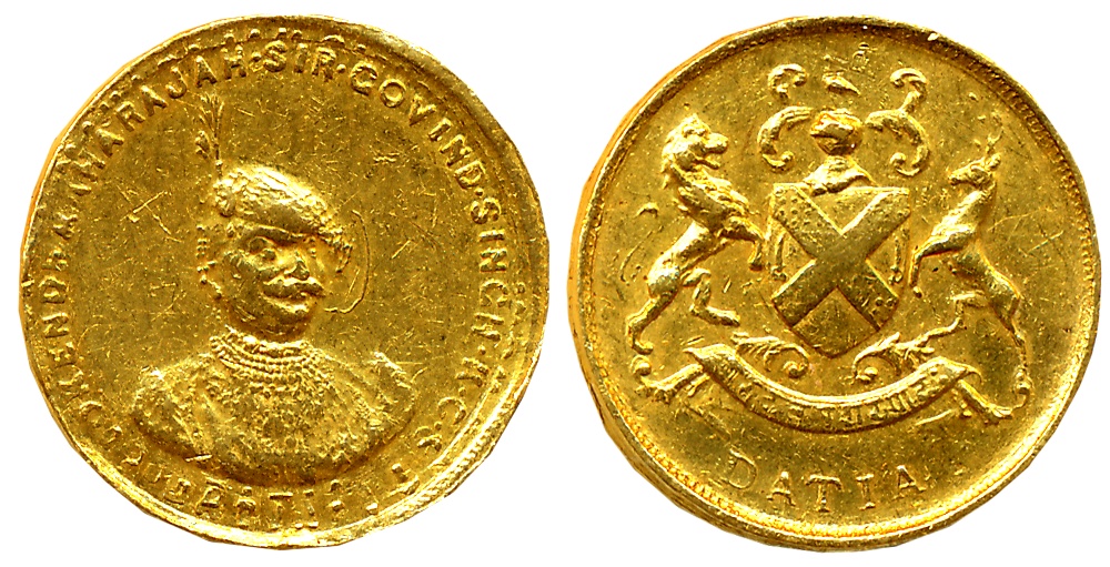Madho Rao, Gold 1/3 Mohur, 3.36g, VS 1959, Obv: Portrait of Maharaja Madho Rao to right, Devnagari legend “Sri Madho Rao Maharaj Shinde” around, Rev: Coat of arms of Gwalior State, Devnagari legend “Riyasat Gwalior” around, date below (KM# 175). Very fine, extremely rare.