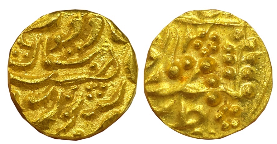 Umed Singh, Gold 1/2 Mohur, 5.32g, in the name of Shah Alam II, Qila Shahabad Mint, RY 45 (not listed in KM). About extremely fine, exceedingly rare. Most likely the first ever known gold fractional coin of the Qila Shahabad mint. Shahabad fort was constructed in the 17th century in the Baran region near Kota. In 1838 it was recognised as a discontinuous part of Jhalawar State and handed over from Kota to Jhalawar. The mint remained operational under both states.