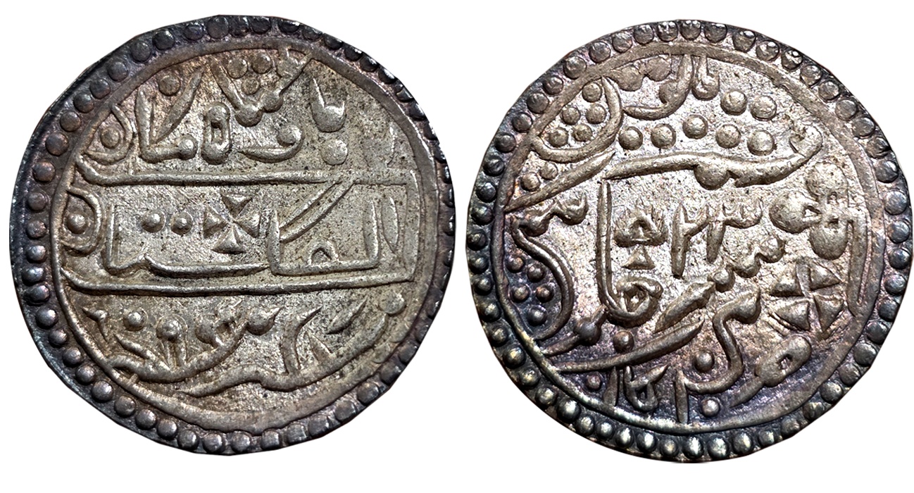 Maharao Shri Pragmalji II, Silver 5 Kori, 1st issue, VS 1921/ AD 1863, Obv: Devnagari legend “Maharajadhiraj Mirza Maharao Sri Pragmalji Bahadur Kutch Bhuj in dotted outer circle, Kori 5, 1921” in inner circle, Trishul, Crescent & Katar above, Rev: Persian legend “Muazzama Queen Victoria zarb Bhujnagar, 1863” in inner circle, leaves motif in outer circle (KM# Y# 16, RS# 180.1). Extremely fine, extremely rare.
