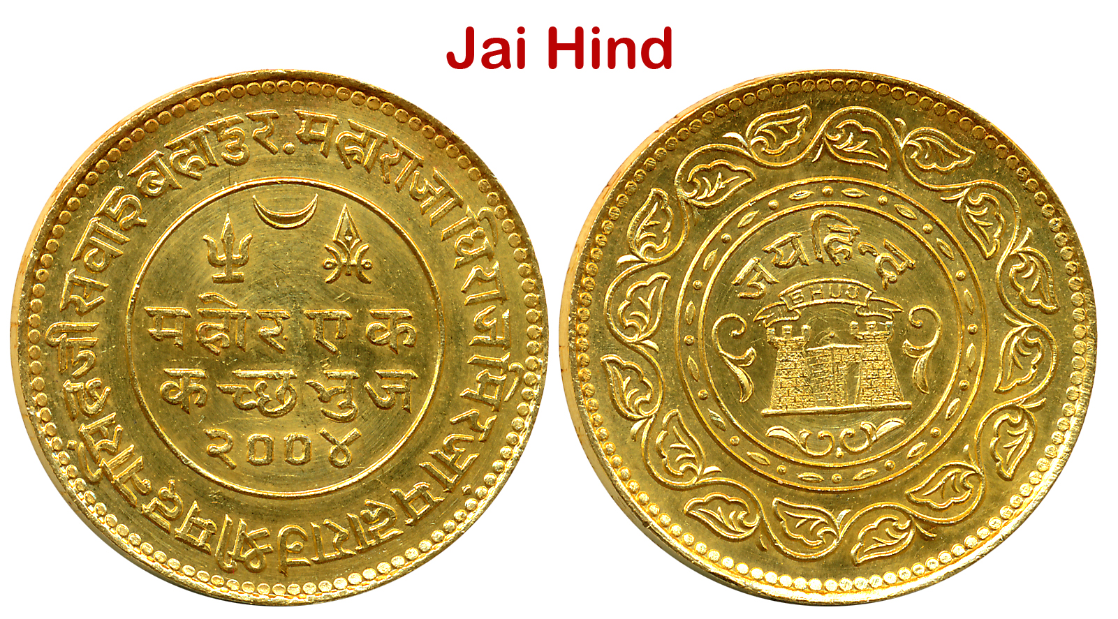 Maharao Shri Pragmalji III with Queen Pritidevi, Gold Kori Token, 4.58g, VS 2048, issued after Independence at the time of Coronation of Maharaja Pragmalji III as ritual ceremony of Kingship. Uncirculated, rare.