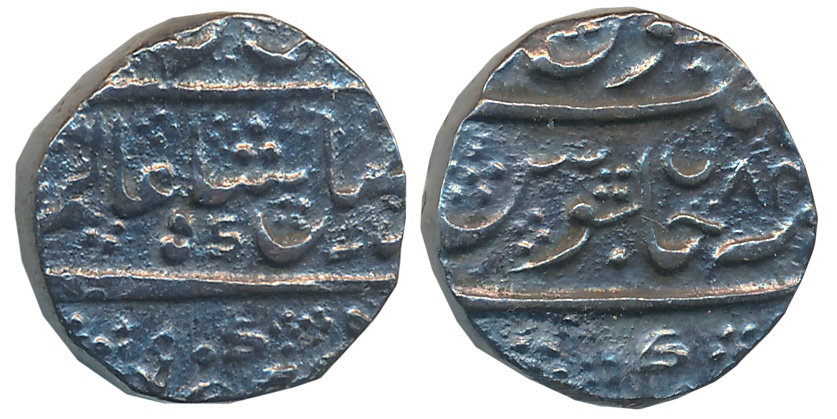 Krishna Raj Wodeyar, Silver 2/3 Rupee- Pavali, 1.79g, in the name of Shah Alam II, Obv: Dancing figure of Goddess Chamundi, Rev: Kannada legend (KM# C# 201). Uncirculated.