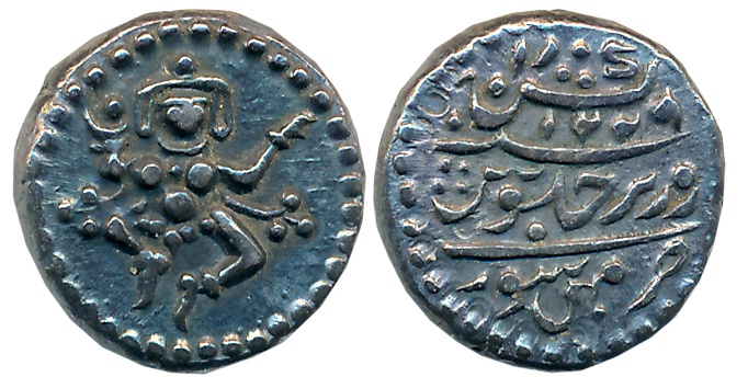 Krishna Raja Wodeyar, Silver 1/3 Rupee- Pavali, 0.88g, in the name of Shah Alam II, Obv: Dancing figure of Goddess Chamundi, Rev: Kannada legend (KM# C# 200). Extremely fine.