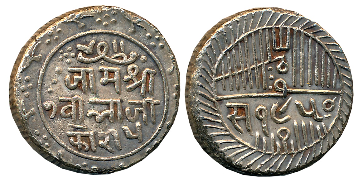 Raja Mahendra Dharam Pal, Gold Special Nazarana 1/2 Mohur, 5.40g, in the name of Shah Alam II, AH (12)33/ RY 7. About extremely fine, exceedingly rare. Raja Dharam Pal succeeded his father Maharaja Vikramjit when the latter abdicated in favour of his son in 1817. This half mohur was most likely produced as a special issue to fulfil ritual commitments that followed the investiture. The RY here appears to be counted from 1811/12 when Vikramjit formalized his relations with the British.