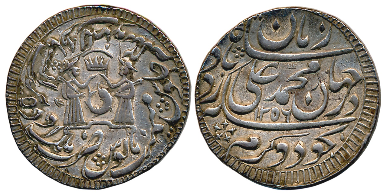 Amjad Ali Shah, Silver Rupee, 11.13g, Mulk Awadh Bait us Sultanate Lakhnau Mint, AH 1258/ RY Ahad, Crown above Fish on obverse (Master & Kapoor# 10.02). Extremely fine+, rare.