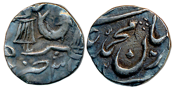 Wajid Ali Shah, Silver Rupee, 11.14g, Broad flan, Mulk Awadh Bait us Sultanate Lakhnau Mint, AH 1267/ RY 4, Parasol above crown flanked by Mermaids holding flag crossed swords below on obverse (Master & Kapoor# 11.32). Extremely fine+, rare.