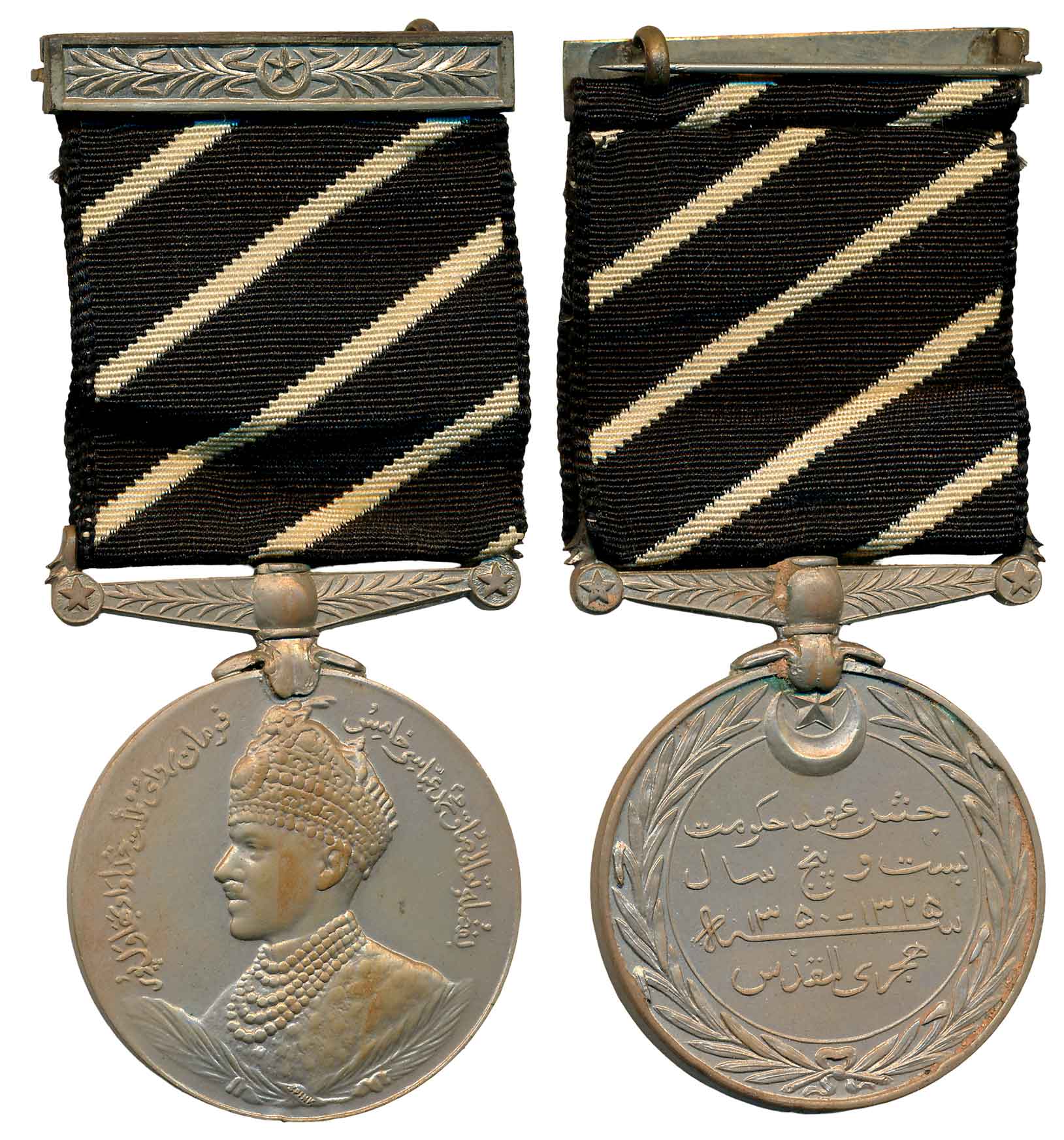 Bundi, Maharao Bahadur Singh, Silver Accession Medal, 26.52g, 1945, Obv: Three-quarter portrait bust of Bahadur Singh, Rev: Coat of arms of Bundi State in center around legend “BAHADUR SINGH MAHARAO RAJA” above; “BUNDI/14 MAY 1945” below. with ribbon and suspender (McClenaghan 97). Very fine+, extremely rare..