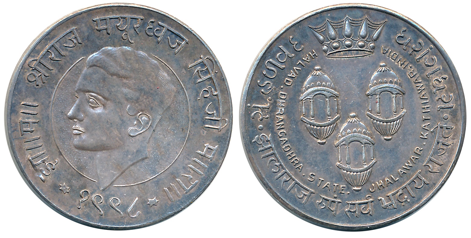 Kolhapur, Chhatrapati Shahaji II, Silver, Coronation Medal, 20.59g, 1947, Obv: Bust of Chhatrapati Shahaji II, facing front, within a circle, Devnagari legend “Chhatrapati Shahaji 2” above, “Hindu Pud Pad Shah” below, with morchels as separators, Rev: In the centre ‘Bhavani’ sword of Chhatrapati Shivaji and Devnagari legend “Jay Bhavani” within a circle, Devnagari legend “Karavir Rajya” above, date Je. Shu. (Jyesth Shukla) 13 Rajashaka 274 below (McClenaghan 189). Very fine, extremely rare.