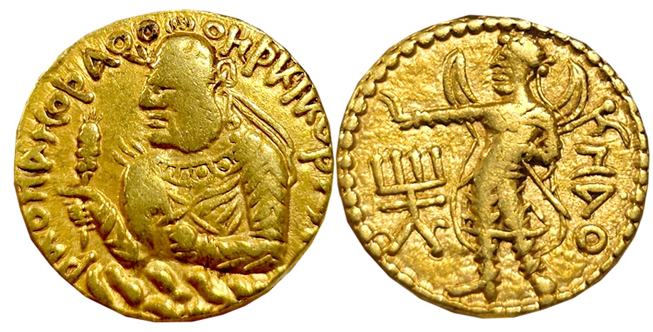Kushans, Huvishka, Gold Dinar, 7.87g, with Fire God Pharro, main Mint in Bactria (probably Balkh), early phase, Obv: Half length bust of Huvishka left, on clouds or mountain top, wearing heavy sideburns, round helmet with crest ornament, twin-pronged forehead ornament, crescent on side, and a jewelled rim, diadem with triangular tie and double ladder-like ribbons to right, and loose-fitting tunic with jewelled collar, flames emanating from right shoulder, club in right hand with extended index finger, sword hilt in left, Bactrian legend “ShAONANO ShAO OOEShKI KOShANO” around, Rev: God ‘Pharro’ standing facing, with nimbate head turned right, wearing helmet with forehead ornament, diadem with triangular tie and two ribbons to left, cloak around shoulders double-clasped at chest over calf-length tunic, and boots, grounded staff with knob finial in left hand, bag of coins in right palm at waist; Bactrian legend “PhARRO” to left and tamgha with crossbar in right field (Göbl 141/7). Very fine+, extremely rare.