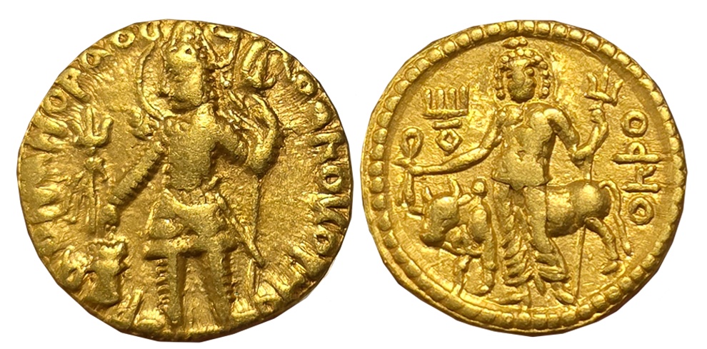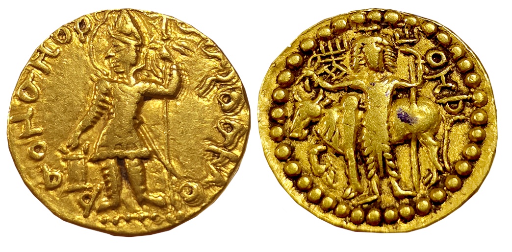 Kushans, Huvishka, Gold Dinar, 7.74g, with Sun God Miiro, main mint in Bactria (probably Balkh), late phase, Obv: Nimbate half-length bust of Huvishka left, on mountain top, wearing triangular helmet with pointed jewelled earflap, forehead medallion, crest jewel, and circular and crescent side ornaments, two diadems with triangular ties with ladder-like ribbons over both shoulders, jewelled tunic with rolled lapels, jewel-edged armlets, club in right hand with pointed index finger, transverse filleted scepter with elliptical finial in left hand over shoulder, Bactrian legend “ShAONANO ShAO OOEShKI KOShANO” around, Rev: Female deity Ardokhsho, nimbate, standing facing, turned right, ankle-length garment clinging to breasts wrapped around waist with end folds draping to right from left arm, worn over long-sleeved under-garment that falls in folds to cover feet, cornucopia filled with coins upright in both hands, Bactrian legend “MIORO” to left and tamgha to right (Göbl# 380). Very fine+, extremely rare.