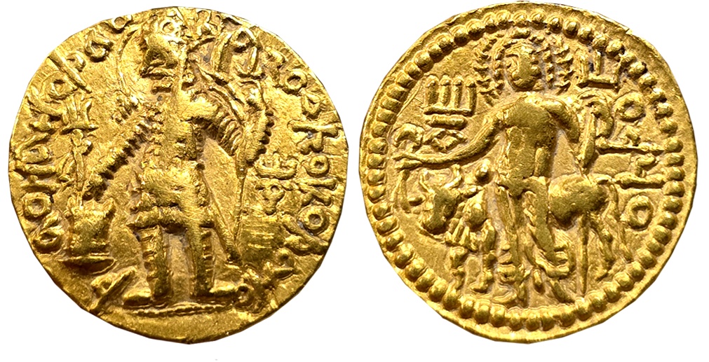 Kushans, Huvishka, Gold Dinar, 7.63g, with Moon God Mao, main mint in Baktria, Obv: Crowned, diademed and draped bust of Huvishka emerging from clouds or a mountain top with flames on his right shoulder, holding club in his right hand and hilt of sword in his left. Bactrian legend “ShAONANO ShAO OOEShKI (KOShANO)” around, Rev: Moon deity Mao standing front, head turned to left, with a large crescent behind his shoulders, raising his right hand in benediction, Bactrian legend “MAO” to right and tamgha in left field (Göbl# 313). Very fine+, very rare. Mao is the moon god that is often depicted in the Kanishka I and Huvishka’s coinage. ‘Mao’ is Mah, the Lunar deity of importance in Zoroastrianism and related central Asian contexts. In Avestan literature Mah was seen as the repository of the good deeds of men. On the coinage of the Kushan Empire the moon god, known as Mao, is depicted in martial dress and is equated with the Greek god Selene.