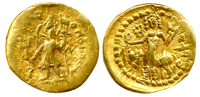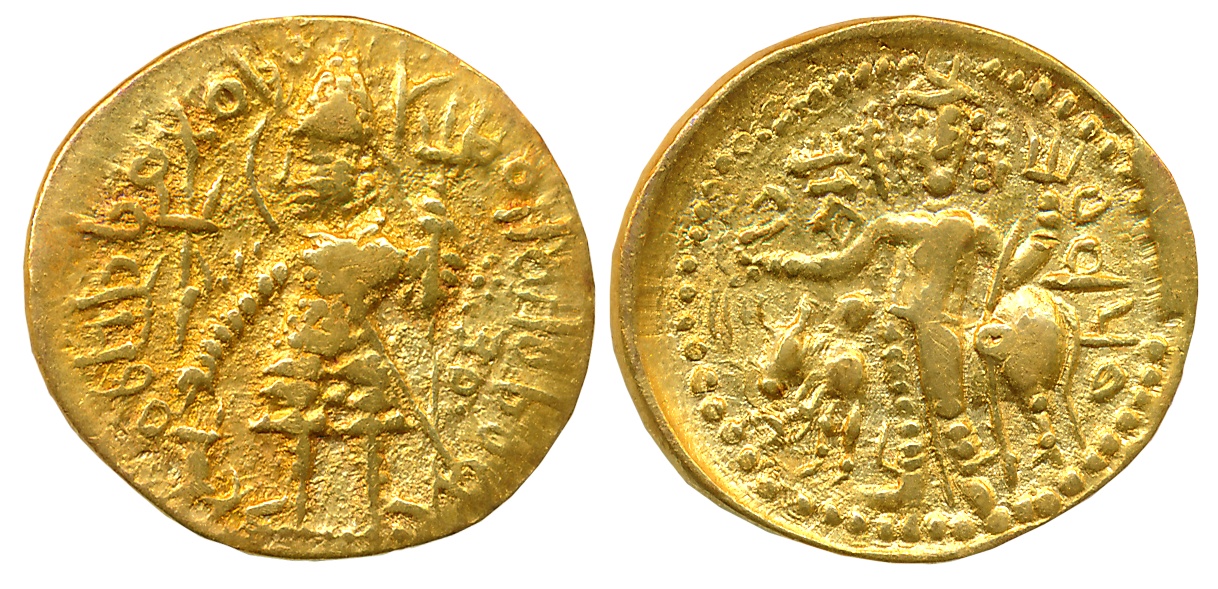 Kushans, Vasudeva I, Gold Dinar, 7.97g,Subsidiary Mint in Gandhara (Peshawar?), Obv: Vasudeva, nimbate, standing facing, head to left, sacrificing over altar and holding trident, flames at right shoulder, filleted trident to left, Bactrian legend “ShAONANO ShAO BAZODEO KOShANO” around, Rev: Ithyphallic Lord Siva standing facing, holding diadem and trident, reclining against the bull Nandi facing left, tamgha to upper left and Bactrian legend “OEShO” to right (Göbl# 535). Very fine+, very rare.
