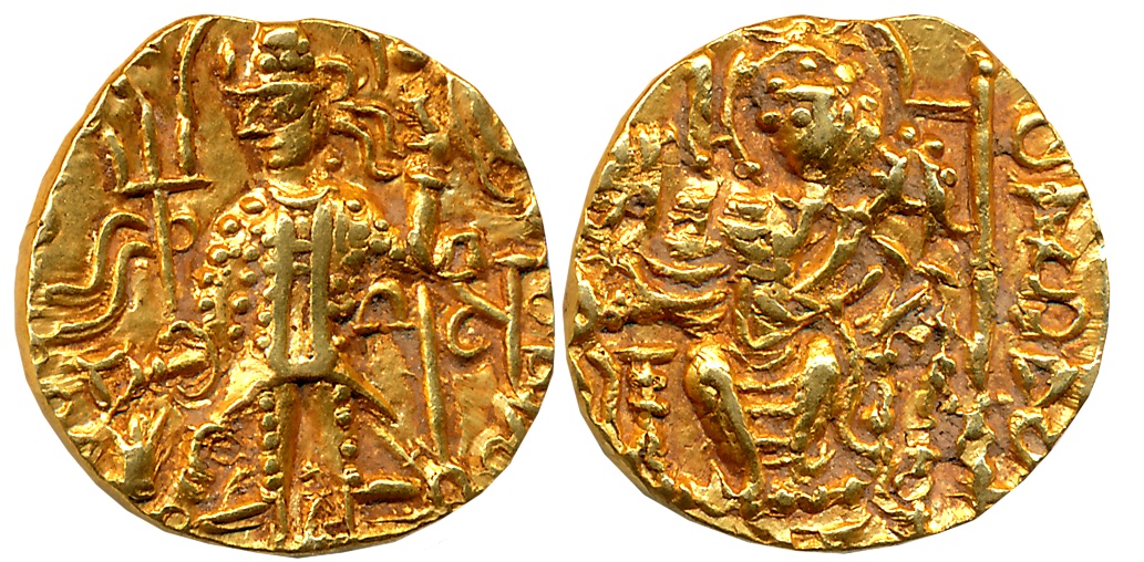 Kushans, Vasudeva I, Gold Dinar, 7.95g, Obv: Nimbate king standing facing, wearing triangular helmet and a diadem, clad in full armour, tunic, trousers and boots, with flames emanating from right shoulder, holding filleted spear in left hand, offering sacrifice over altar with left, filleted trident to left; Bactrian legend “ShAONANO ShAO BAZODEO KOShANO” around and a Triratna symbol to right, Rev: Lord Oesho (Shiva) standing facing, reclining against Nandi the Bull, with one head, hair in topknot with curls outlining long face, erect lingam, wearing dhoti, with trident in left hand and diadem with two ribbons in right (Göbl# 640A). Extremely fine, extremely rare.