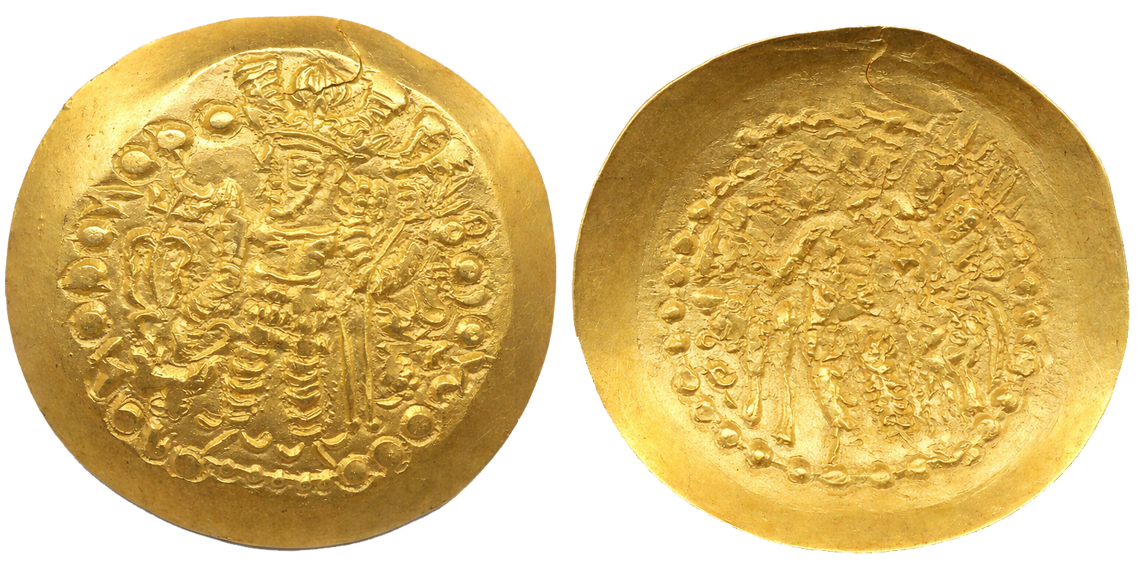 Kushans, Vasudeva II, Gold Dinar, 7.79g, Main Mint in Mathura, Obv: Vasudeva standing facing, head left, sacrificing over altar and holding standard, filleted trident to left, “Bha” in Brahmi to inner left at feet, “Vi” in Brahmi between legs, “Ga” in Brahmi in inner right field, “Vasu” in Brahmi in outer right field, traces of Bactrian legend around, Rev: Goddess Ardoxsho, seated facing, holding filleted investiture garland in right hand and cradling cornucopia in left arm, tamgha to left above (Göbl# 574). Very fine+, rare.