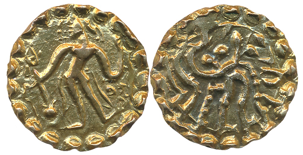 Western Kshatrapas, Viradaman, son of Damasena as Kshatrapa, Silver Drachma, 2.18g, Obv: Bust of the king, Brahmi numerals behind the bust, followed by corrupt Greek letters, Rev: Three-arched hill with a crescent on top, Sun to right, a crescent to left, Brahmi legend starting ~2 O'clock “Rajno MahaKshatrapasa Damasenasa Putrasa Rajnah Kshatrapas Virdamnah” (Fishman# 21.1.160). Complete legend on reverse. Very fine.