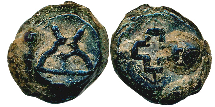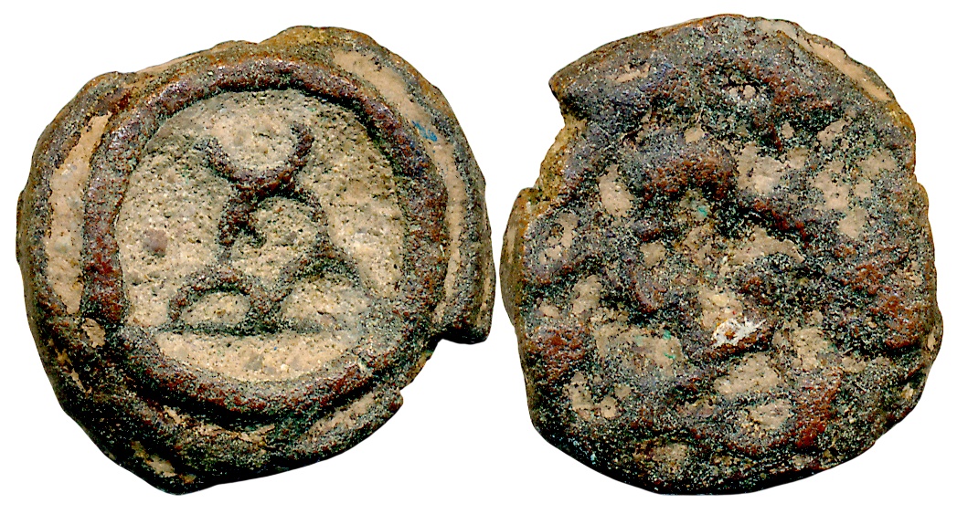 Post Mauryan, Western Malwa, Ujjain/Maheshwar area, Uninscribed die struck Copper, 4.06g, Obv: Horse cantering to right in centre, tree in railing behind, wheel with arrow-spokes to right, river with Fishes below, a row of small symbols, including an 'Ujjain' symbol above, Rev: Ujjain symbol with concentric orbs (PAIC# 734). About extremely fine, rare.