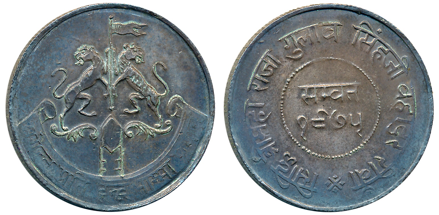 Rama Varma V, Gold 1/2 Sovereign, 4.05g, 1881, Obv: Bust of Maharaja Rama Varma with legend “Rama Varma Maharaja of Travancore 1881” around, Rev: Conch flanked by Elephants above the crown, crossed sceptres, Malayalam numerals 1057 below (B. Sarasan# 216). Extremely fine+, extremely rare. These Gold Sovereigns are not part of the State currency but struck on special occasion. The dies were made in Birmingham Mint and struck at Bombay Mint in 1882 AD. Half Sovereign are rarer than Sovereign.
