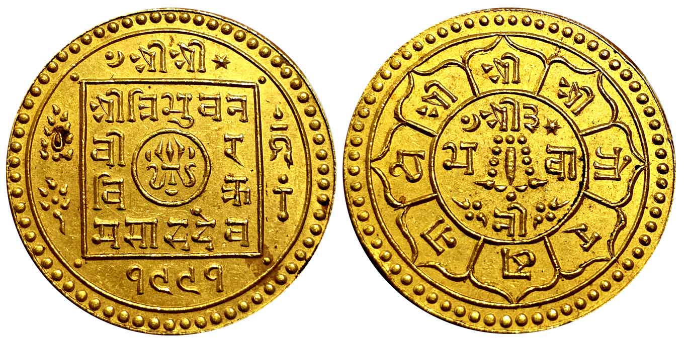 Tibet, Silver 3 Srang, 10.90g, Tapchi Mint, Obv: Snow Lion facing left in front of Mount Kailash with two Suns in the background, all surrounded four Buddhist auspicious symbols (a white parasol, a conch shell, a pair of golden fish, and an endless knot) and Tibetan characters, Rev: Treasure vase (a Buddhist auspicious symbol) containing foliage with scroll ornaments around, all surrounded three Buddhist auspicious symbols (a victory banner, a dharma wheel, and a lotus flower) and Tibetan characters (KM# Y# 26). Extremely fine, rare.