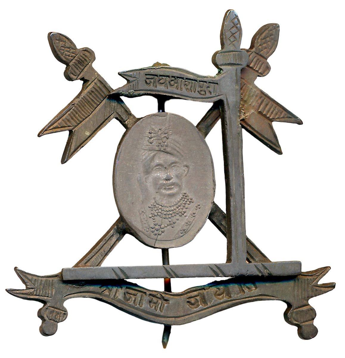 JIND STATE, Crest: On a helmet affrontée, lambrequined Argent and Purpure, an Elephant passant proper, Supporters: A horse and a Lion, Title: JIND STATE, Motto: Mahipala Phalat Phalam in Devanagari legend. Very fine, rare.