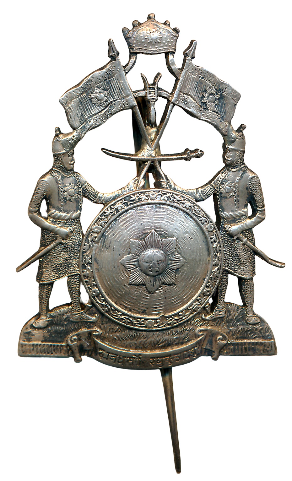 Kutch, State Monogram Metallic Plate, 42.53g, Arms: A sword and axe, an eastern galley (i.e. a sambuk), Crest: On a helmet, a castle ensigned bhuj and elephant with banner, Supporters: Horsemen mounted, the left armed with a sword, the right with a lance, Motto: ‘courage and confidence’. Very fine, rare.