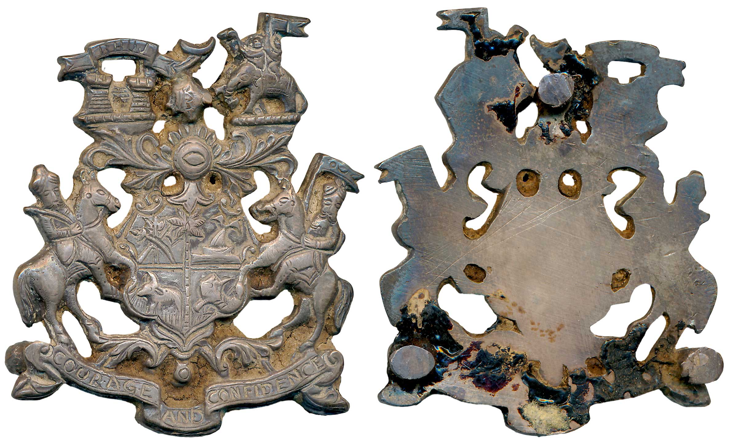 Mewar, Cap Badge for state Police, 1931-32, 17.71g. The design consists of a British ‘tudor’ crown, Sun burst, wreath and ribbon. With pin mount, manufactured by V R Madon and Co.,Aligarh. Very fine, rare.