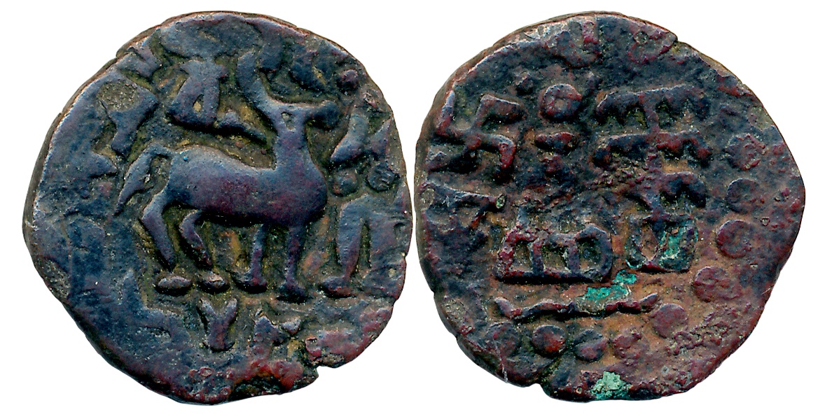 Ayodhya, Saketa region, Jayavarman, Post Mauryan monarchical coinage, Copper, 2.63g, Obv: Bull standing facing left, arched hill symbol to left, Brahmi legend “Rajño Jayavarma” below, Rev: Bold Nandipada symbol within a rectangle (Not Published in major sources). Extremely fine, extremely rare.